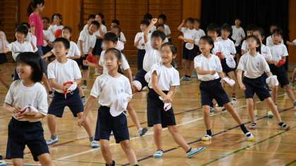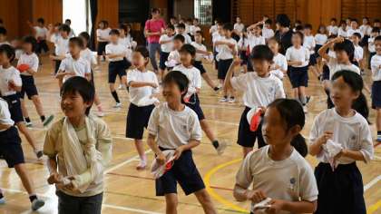 舞台上でおどる教員の踊りをまねしながら、みんな真剣に体をいっぱいに使って踊っていました。