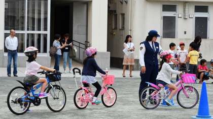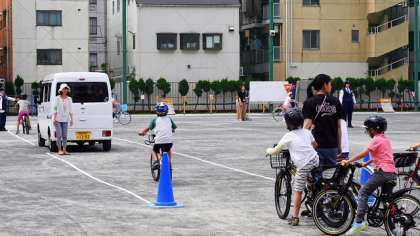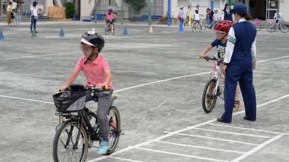 自転車の乗り方実習は、玉川警察署の方を講師に招き指導していただきました。校庭に道路を想定して、自動車や信号機、横断歩道、見通しの悪い交差点などのコースを設定して、警察官と校外委員のみなさんについていただいて、子どもたちは実際に自転車に乗ってコースを回りました。