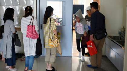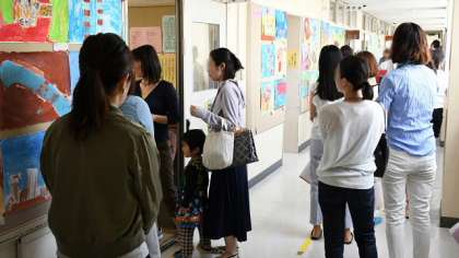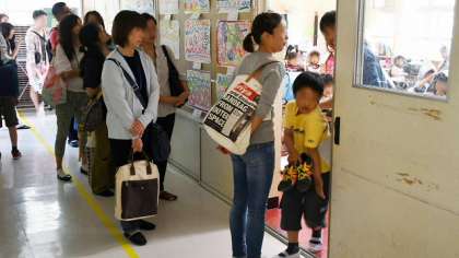 放送による連絡をした後、引き取りの開始です。教室入り口前に整然と並んだ引き取り者(保護者・家族)に順次児童を引き取っていただきました。
