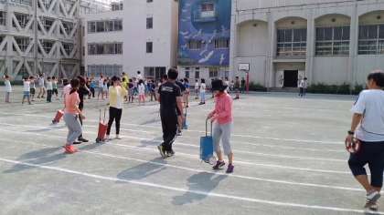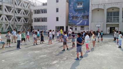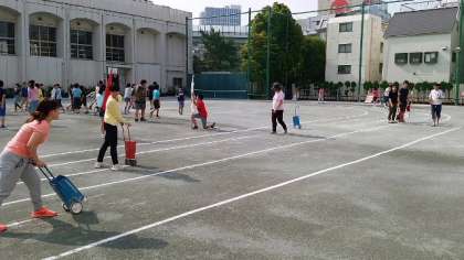 22日(日)に、業者さんに頼んでグリーンダスト(校庭表面の緑色の砂)をまき、ローラーで転圧する作業をしてもらいました。校庭の状態は良くなったのですが、ラインが消えてしまいました。そこで23日(月)朝、専科教諭が中心となってライン引きをしました。後ろでは、今日も応援団が元気に朝練習です。