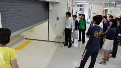 2日放課後、校舎に設置してある防火シャッターについて、教員の研修会を行いました。万が一の火災発生時にシャッターが閉まる場所、その際の避難方法、さらに復旧の仕方について確認をしました。