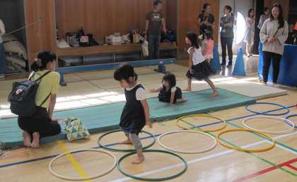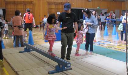 幼児コーナーでは、親子の微笑ましい場面を見ることができました。平均台では、お父さんに手を引いてもらい、慎重に渡っていました。フラフープのジャンプでは、お母さんが優しく見守っていました。