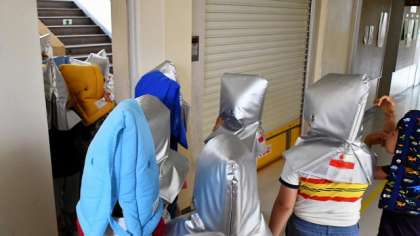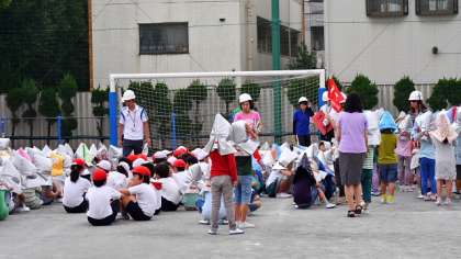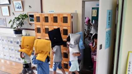 防火シャッターが閉まっている場合は、横にある小さい扉をくぐって避難します。「おかしも」の約束を守り、煙を吸わないように口にハンカチをあてて整然と避難する子どもたちです。