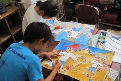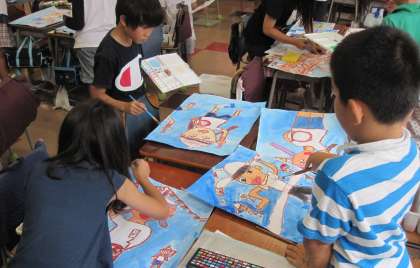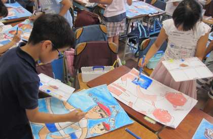 運動会の絵の最後の仕上げをしています。白熱した運動会を思い出すような迫力のある絵が多かったです。真剣に集中して取り組んでいました。