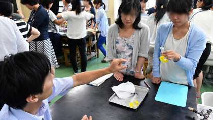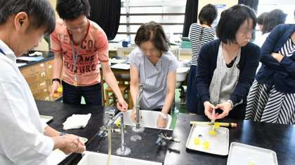 研究授業の後は、いつも教員自らが実験をしてみる時間をとっています。おとなにとって当たり前のような実験も、改めて自分でやってみると、指導するにあたっての留意点に気がつくよい機会となっています。