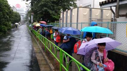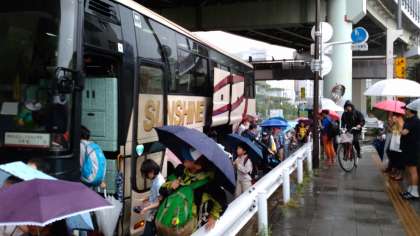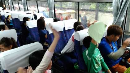 いよいよ川場移動教室へ出発です。荷物をもって雨の中バスへ移動。見送りの保護者家族の皆さんの「いってらっしゃい」の声に送られて各クラス1台の貸し切りバスに乗り込み、さあ出発です。