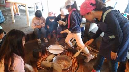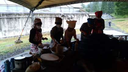 米やカレーの下準備が終わって、かまどの火で調理します。火おこしも煙たくて大変です。