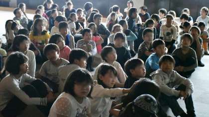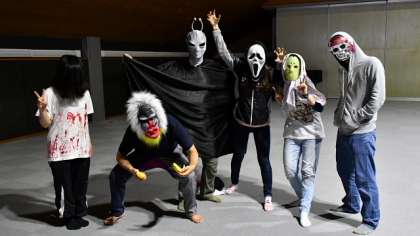 お化けはこんなメンバーです。子どもたちを楽しませようと一生懸命!?がんばりました。ゴール地点の村の会堂(体育館)に集合。騒ぎすぎて気が抜けた感じです。