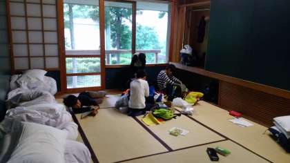 おはようございます。14日(火)、川場移動教室2日目。起床は6時です。6時半までに朝の準備として、検温やふとんたたみ、洗顔などをします。まだ眠そうな顔をしている子もいますが、みんなで声をかけあってしっかり行動しています。