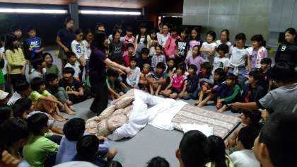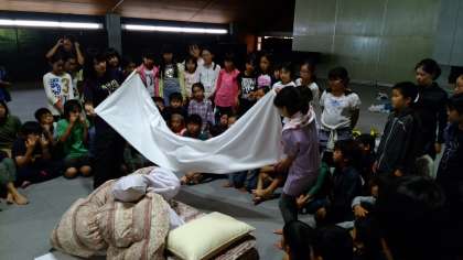村の会堂で、明日の朝のふとんの片付けについてレクチャーしてもらいました。
