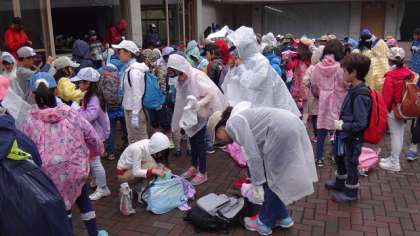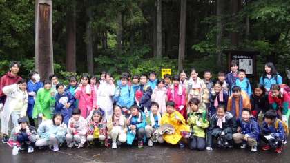 5年生移動教室は2日目。ようすを速報版でもお知らせしましたが、2日目のハイライトシーンをお届けします。天気予報では晴れマークでしたが、朝から霧雨がやまず、ハイキングは雨具着用で始めました。