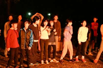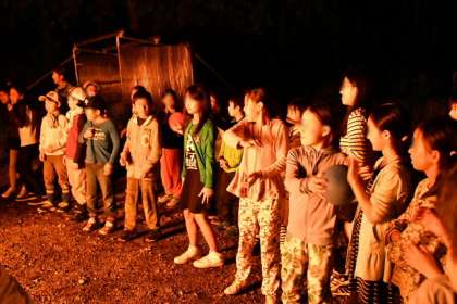 炎が子どもたちを照らし、幻想的な雰囲気です。