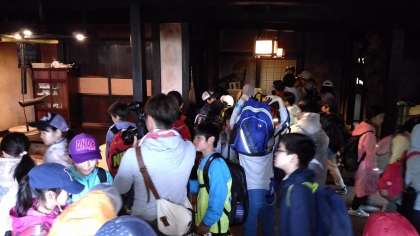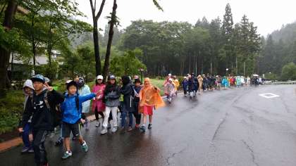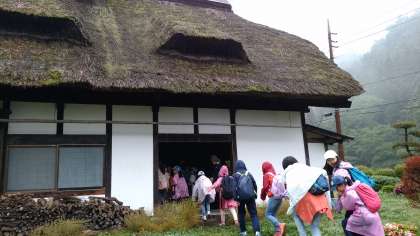 村めぐりに出発です。霧雨です。古民家の中も見学しました。