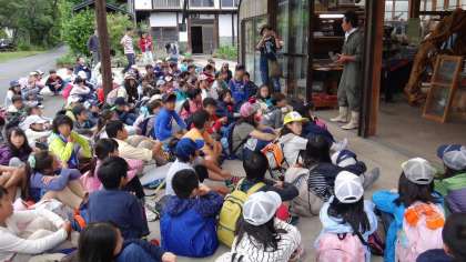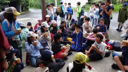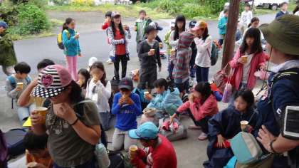 愛宕山を登った後、近くのリンゴ農家を訪ねて、100パーセント天然果汁のリンゴジュースを飲みました。ちょうどのどが渇いていたので、おいしいジュースが体に染みわたっていくようです。飲み終わった後、農家の方からリンゴ作りについてお話を伺いました。