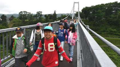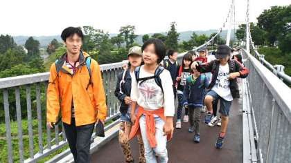 人と自転車しかわたれない立派な吊り橋「ふれあい橋」をわたり、村めぐりのゴール、田園プラザも目の前です。
