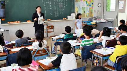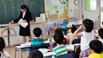 実習生による2年生の国語の授業です。国語の教科書の例文を、句読点やかぎ括弧を使って、読みやすくわかりやすく書く学習です。例文を見ながら、意見を出し合い、最後には原稿用紙に自分で書いて、学習したことを確かめました。子どもたちは熱心に学習に取り組んでいました。3人の実習生は、この日、子どもたちに別れを告げて、2週間の実習を終了しました。