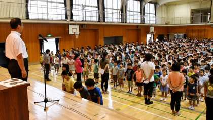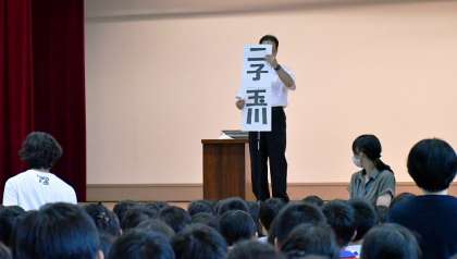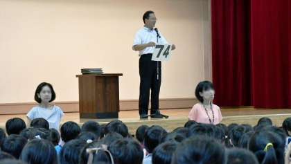 20日(月)は開校記念日で学校はお休みでしたから、21日(火)が今週のスタート。朝から雨が降っていたため、朝会は体育館で行いました。本校は開校74周年。講話ではそれにちなんだ話をしました。まず「74」という数字を出して、何の数字でしょう?・・・これはすぐにわかりました。今度は「二子玉川」の地名の由来について話しました。川崎の「二子」という地名と、現在も町の名前となっている「玉川」を駅を作るとき合体したのはそもそもの始まりのようです。最後に、卒業生台帳を見せて、昨年までの74年間で、7900人以上の卒業生が出ていることを伝え、今エンドの卒業生の中で、区切りのよい「8000」番の人が出るということも話したところ、みんながどよめきました。