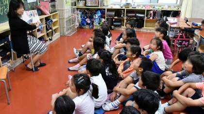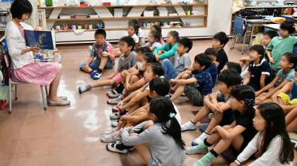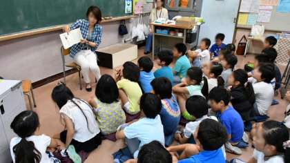 こちらは3年生のようすです。読み聞かせする本も3年生にふさわしい内容の本を慎重に選んでくださっています。こちらもみんな熱心に聞き入っています。