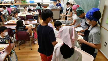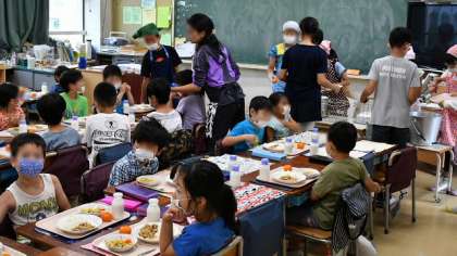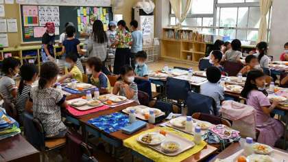 5日(火)、なかよし班給食を行いました。本校では、1年生から6年生までの児童がグループを作って、なかよし班を構成し、様々な活動をしています。この日は1学期初めての、一緒に食べる給食です。高学年の児童が一生懸命がんばって準備を配膳などのしました。