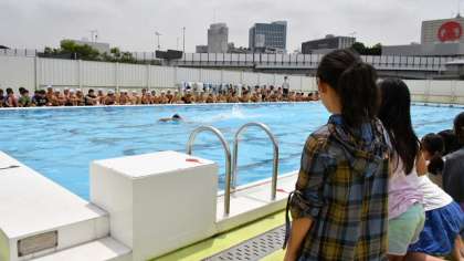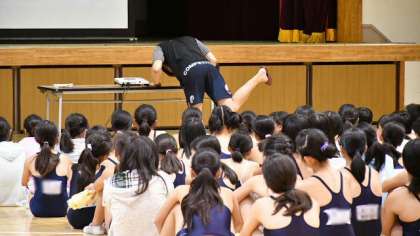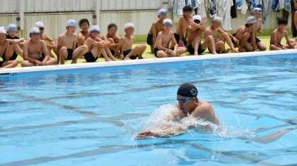 5・6年生には泳ぎ方についての指導もしていただきました。4校時、6年生が体育館で基本的な平泳ぎの足の使い方などを教えていただき、プールに場所を変えて、模範泳法を見学しました。
