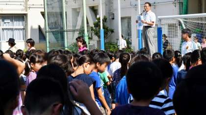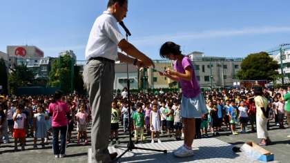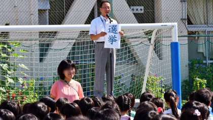 11日(月)、朝から日差しが強く照りつけていましたが、朝方でまだ気温はあまり高くなかったので校庭で朝会を行いました。校長講話では、昨日行われた選挙から、選挙権が18歳に引き下げられたこと、そして6年生にとっては7年後には選挙権が与えられるので、関心をもってニュースなどを見てみましょうと言うことを呼びかけました。また、利根川上流のダムの貯水率が低いことを伝え、節水を呼びかけました。日差しが強い中でも、子どもたちはしっかり話を聞くことができました。