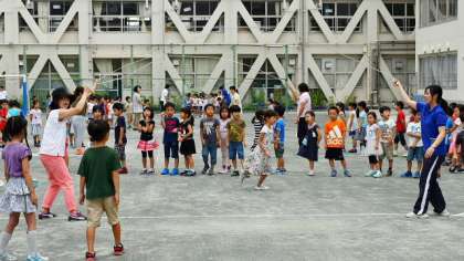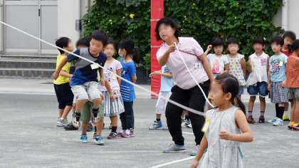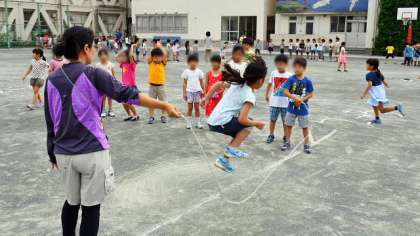 こちらは1年生のようすです。まだ始めたばかりということもあって、跳べること跳べない子の差がありますが、みんなで励まし合ってがんばっていました。