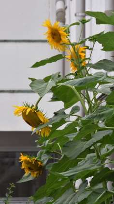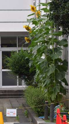 学校のヒマワリ、特に西校舎前の、本校の学校主事が丹精込めて育てたヒマワリが巨大化して、2階のフロアーの高さを超えています。通りかかる人たちもびっくりしています。