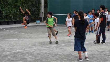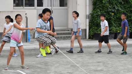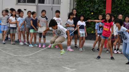 3分間で何回跳べるかという挑戦です。クラスによって跳ぶ方向や並び方を工夫して練習しています。