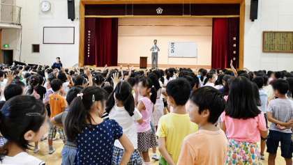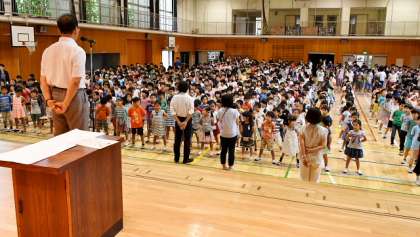 20日(水)、1校時、1学期の終業式を体育館で行いました。校長講話で1学期の振り返りと、夏休みに期待することを話しました。「夏ならでは」ということで、プール、図書館開放、地域の行事などにどんどん参加してほしいこと、さらに一人一人が通常はできないことに取り組んでほしいことを例に挙げました。
