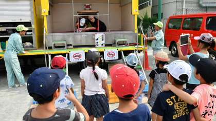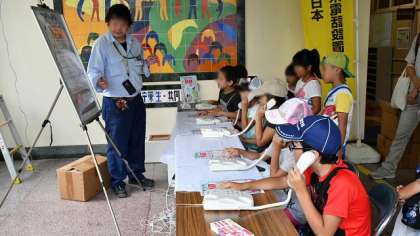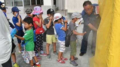 グループは各学年が混ざっています。さすがに上の学年のこどもたちは熱心で、下学年のこのサポートをしてくれます。写真は上から「煙中脱出訓練」「起震車体験訓練」「安否確認電話体験訓練」