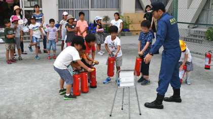 訓練を約1時間半しっかり行って、終了したのは5時です。よく頑張りました。写真上から「消火器訓練」「防災倉庫見学」