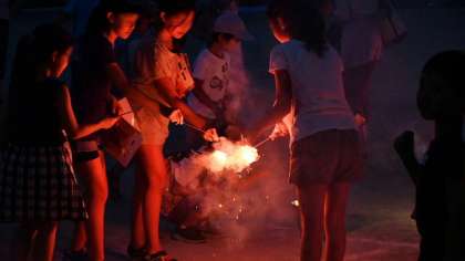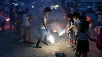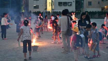 防災学習会の後、宿泊をしない防災訓練参加者のみなさんはここで帰ることになります。参加の記念に花火をもらい、校庭で家族一緒みんなで花火を楽しみました。