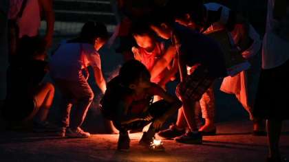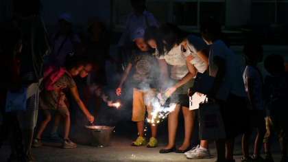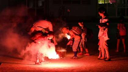 このころになると辺りも暗くなり、しばしの間、校庭は花火の白い煙につつまれ、火花があちこちで鮮やかな光をはなって、幻想的な景色になりました。