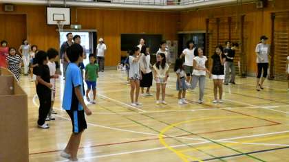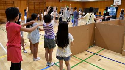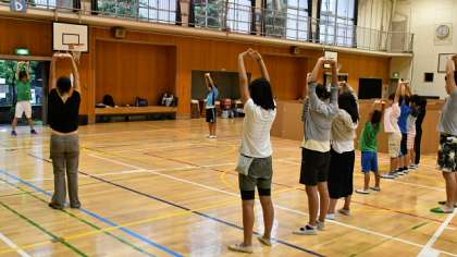 昨日からの避難所宿泊防災訓練、体育館に宿泊したみなさんの21日(木)朝の起床は6時です。朝の身支度をして、最初に体操をして目を覚ましました。