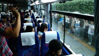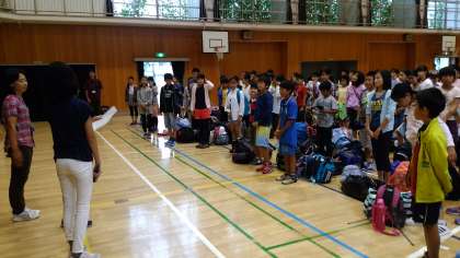 7月22日(金)、6年生が今日から2泊3日で日光林間学園に出かけます。そのようすは、この速報でご覧ください。朝7時40分、雨のため、体育館に集合。出発式を行い、貸し切りバス3台に乗り込んで、出発です。