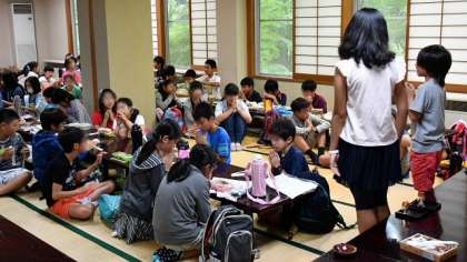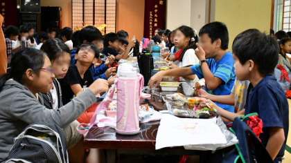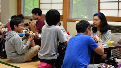 予定では、大谷川公園で昼食だったのですが、天候がおもわしくなく、直接、宿舎の「ホテル高照」に向かい、持参したお弁当を食べました。みんな美味しそうに食べていました。