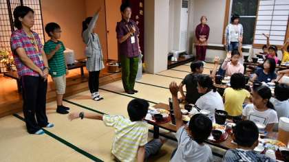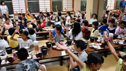 夕食のようすです。目の前に並んだ夕食に、「豪華だと思う人?」と聞いたら、みんな手を上げていました。