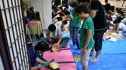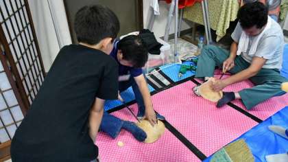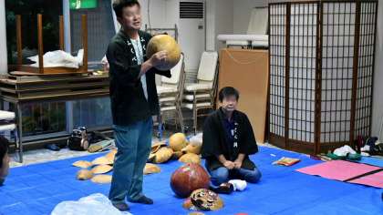 夕食後の「ふくべ細工」には、二人の職人さんがいらして、製作の準備と作り方の指導、そして「ふくべ」に目や口の形の切り込みを入れる作業をしてくださいました。鮮やかな手つきに子どもたちも興味津々です。