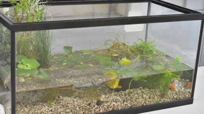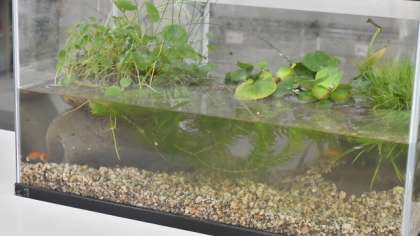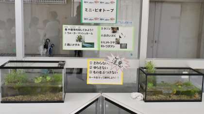 新校舎の昇降口に、ミニビオトープが飾られています。夏休みの理科研修会に参加した教員が、参加者代表としてもらってきたものを再アレンジして飾っています。水生植物やエビ、魚で構成されている自然の水辺を再現しています。学校にお立ち寄りの際にご覧ください。
