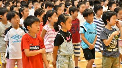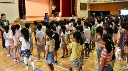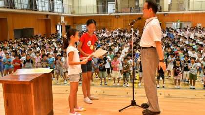 この二人の5年生の機転を利かせた行動、勇気をもって話しかけた態度、そして見通しをもった対応ができる知恵は称賛に値します。そこで、表彰状をつくって二人を表彰しました。今週は「三校合同あいさつ運動」後半に学校公開があります。また、「美しい日本語週間」として、9日(金)には教科日本語の公開授業も行います。朝会ではそのお知らせもしました。暑い中で少し長い時間の朝会となりましたが、みんなしっかりと姿勢を保ち、話を聞くことができました。立派です。