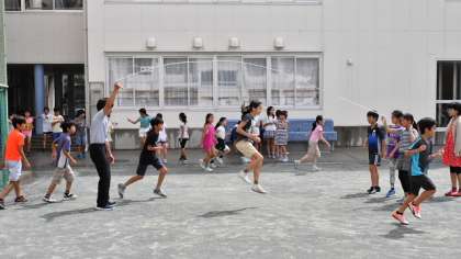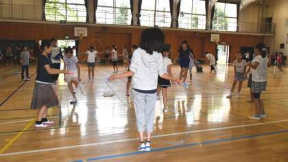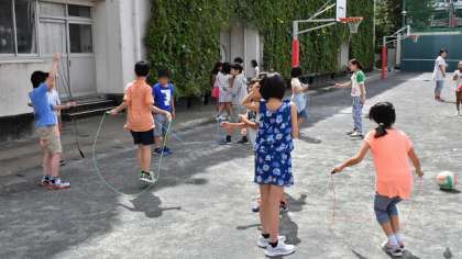 運動タイム、高学年はなわ跳びです。クラスによって長なわ跳びや短なわ跳びに取り組みました。蒸し暑かったのですががんばりました。