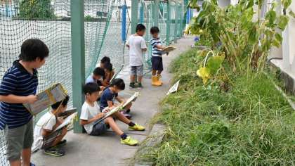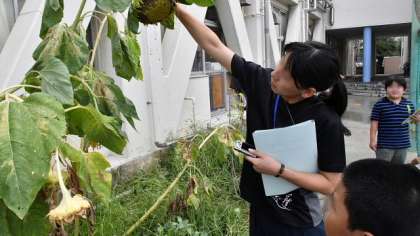 7日(水)、3年が校庭で理科の学習、野外観察をしていました。1学期から観察している植物の学習です。主にヒマワリとホウセンカを観察しています。夏休みがすぎてすっかり様子が変わった植物を見て、興味深そうにスケッチしていました。ひまわりの根元は、バッタ類を集めようと思い、雑草を伸ばしています。