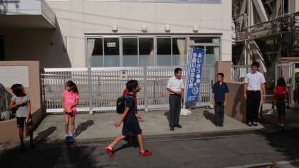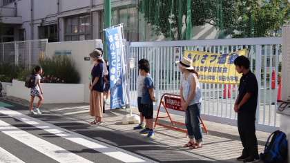 月曜日から始まった三校合同あいさつ運動、9日のようすです。今朝も中学生、保護者のみなさんが参加して、残暑の日差しが強い中、子どもたちにあいさつをしてくださいました。明日が最終日になります。学校西門前は明朝、自動車が通りますので、交通整理も必要になります。