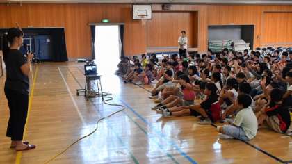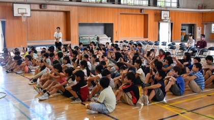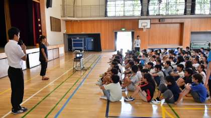 9日(金)4校時、3校時の保護者向けに続き、体育館で「ネットリテラシー醸成講座」を行いました。講師の先生が子供たちに、インターネットにつながる機器をどれくらい使用しているか尋ねると、ご覧のようにたくさんの子が手をあげていました。