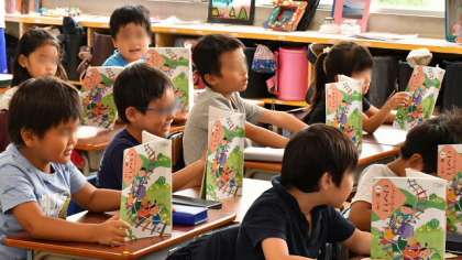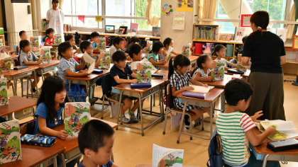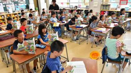 学校公開2日目のこの日、教科「日本語」以外にも授業を公開しました。写真は1年3組の国語のようすです。「大きなかぶ」のお話を、みんな大きな声で元気に音読していました。