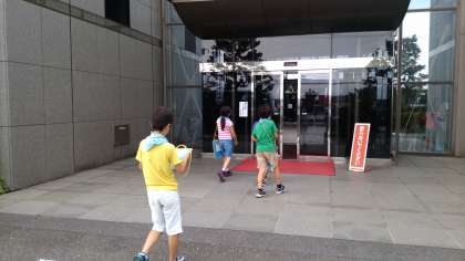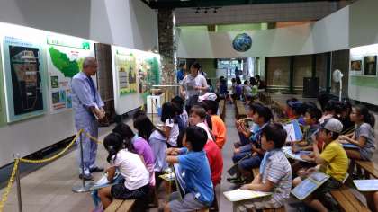夢の島公園からバスに乗って、1時20分、中央防波堤ゴミ処分場事務所に到着。前半は2・3組は展示コーナーでゴミについての学習を、1組は、バスで粗大ゴミの処理場と埋め立て処分場を見学します。