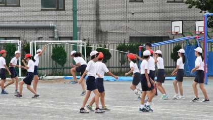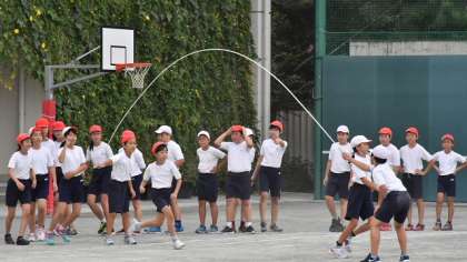 連合運動会の練習、後半は長なわ跳びの練習です。それぞれクラスでエントリーします。掛け声を出して、みんなが気持ちを一つにして頑張ります。本番まで練習を積み重ねます。