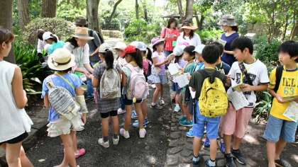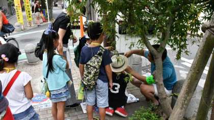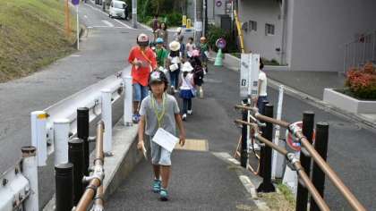 用賀地区委員会が作成した「てくたくマップ」を手に、グループごとにチェックポイントを回ります。チェックポイントには。世田谷区が設置した道標があり、そこで拓本をとっていきます。各場所や途中の道案内など、本校PTAの皆さんが運営にあたってくださいました。