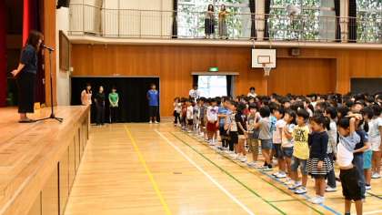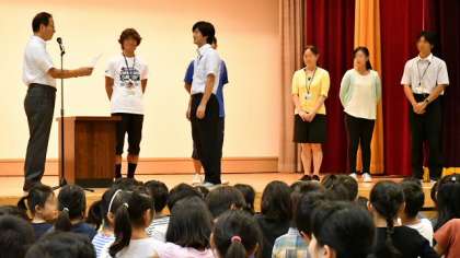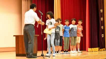 続いて表彰が2件。最初は玉川地区の野球大会で準優勝となった二子玉川スポーツ少年団野球部5年生の表彰です。大きなトロフィーも授与しました。続いて、先週土曜日に行われた教員テニス大会で、教員チームが世田谷区全体の第三位になり、そのメンバーを表彰しました。子どもたちから大きな祝福の拍手がおくられていました。