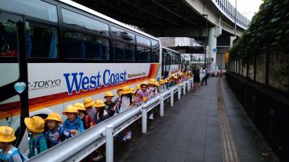 23日(月)、1年生の遠足です。今日はこのページで現地からようすをお知らせします。朝から小雨が降っていますが、予定通り貸し切りバスで横浜の野毛山動物園に出かけます。バスに乗り込んでさあ出発です。
